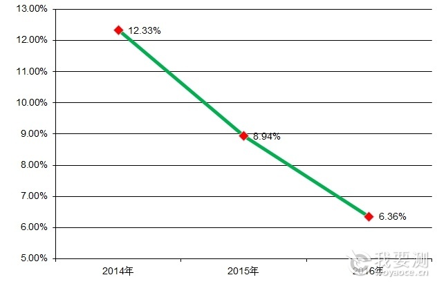 近四年檢驗檢測行業營業收入的變化是這樣,2013年接近1400億,2016年到了2065億,營業收入的年度同比增幅呈現一個V形的趨勢,現在2017年的數據沒有出來,總體趨勢還有待觀察。還不知道2017年是繼續回升,還是變成L形,還是別的什么趨勢。行業的總體發展趨勢需要多年數據的積累。